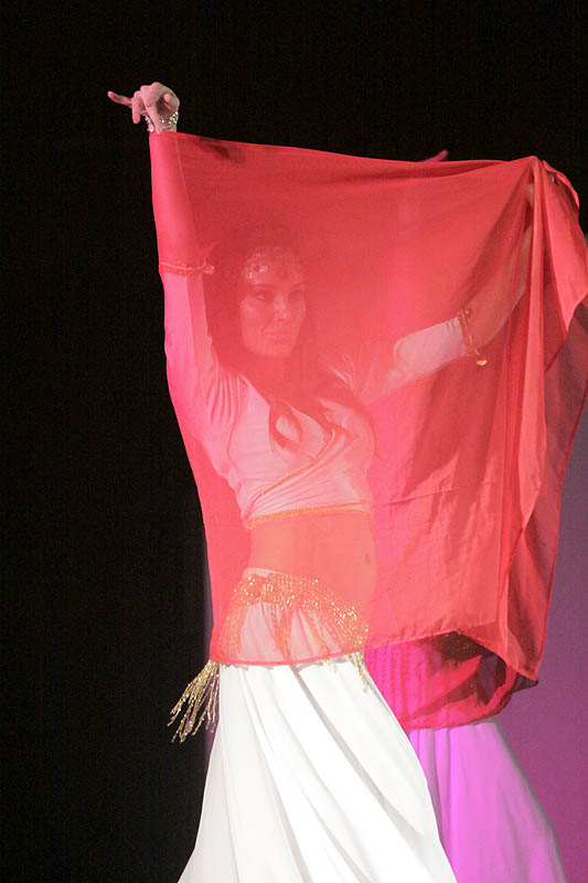 Sara Riquelme y su compañera ejecutando la "danza del vientre". A la derecha, Sandy Ortiz